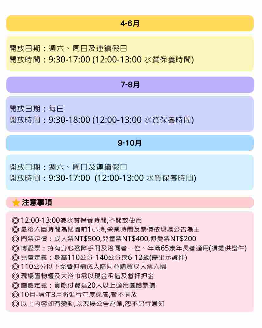 04-06月 開放日期:週六、週日及連續假期;開放時間:09:30-17:00(12:00-13:00水質保養時間)。